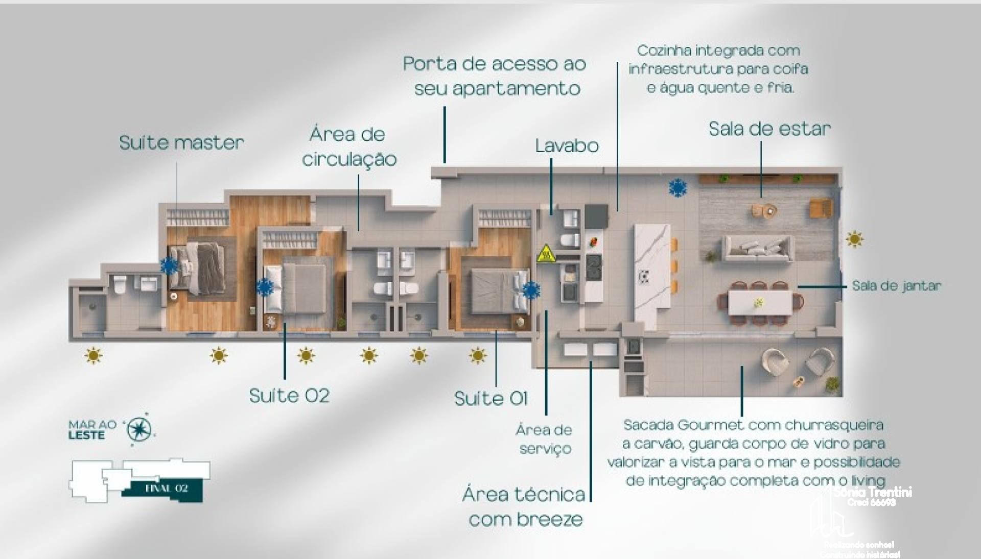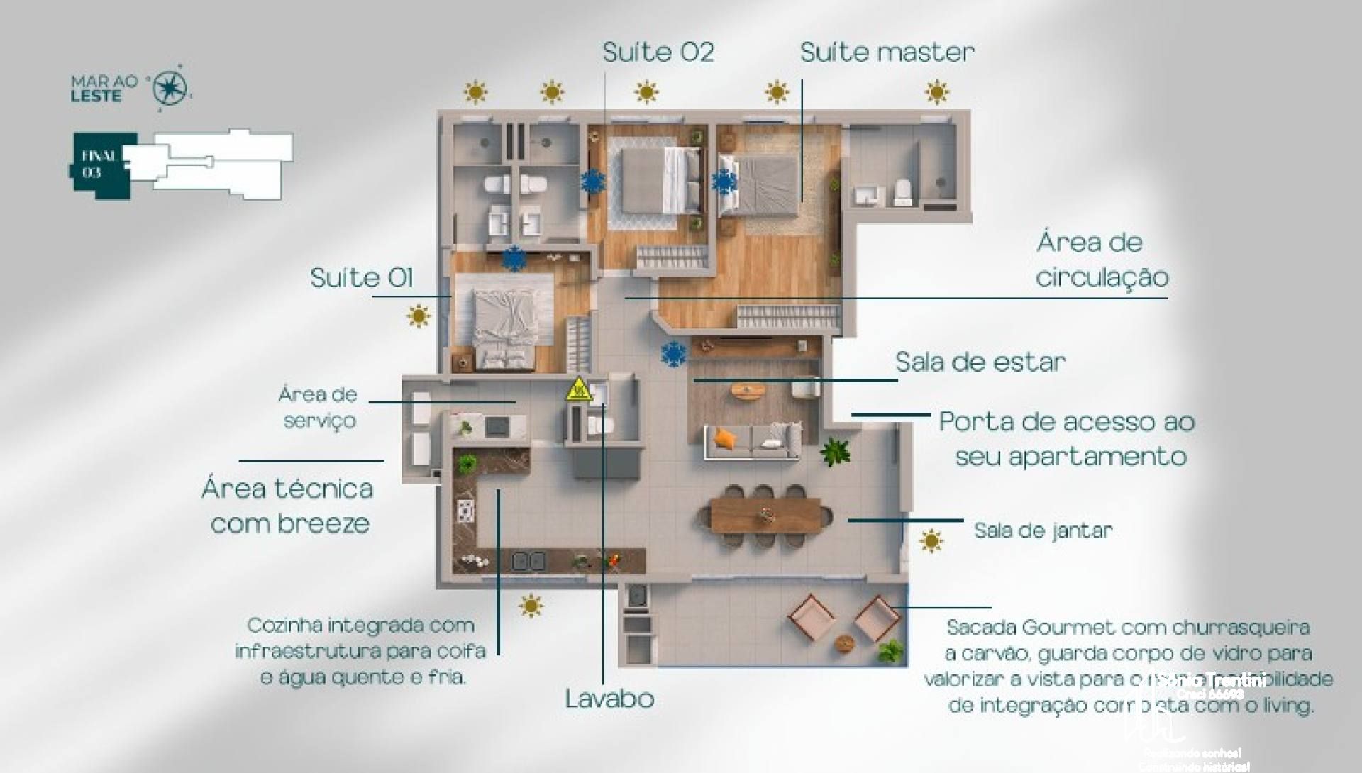 Apatamento 1001 132m² - Frente1 Suíte Master2 SuítesLiving IntegradoLavaboÁrea de ServiçoSacada Gourmet2 Vagas de GaragemAcabamento em gessoAquecimento a GásEspera para splitGás IndividualHidrômetro IndividualInfraestrutura para água quentePorcelanatoO EmpreendimentoAcademiaBarBicicletárioBrinquedotecaElevador ( 2 sociais 1 de serviço)Entrada p/ banhistas e box de praiaEspaço gourmetEstar SocialGuarita de segurançaHall de entrada decorado e mobiliadoMedidores de água, luz e gás individuaisPiscina adultaPiscina infantilPiscina térmicaPlaygroundReaproveitamento de águaSala de gamesSala de jogosSalão de festas